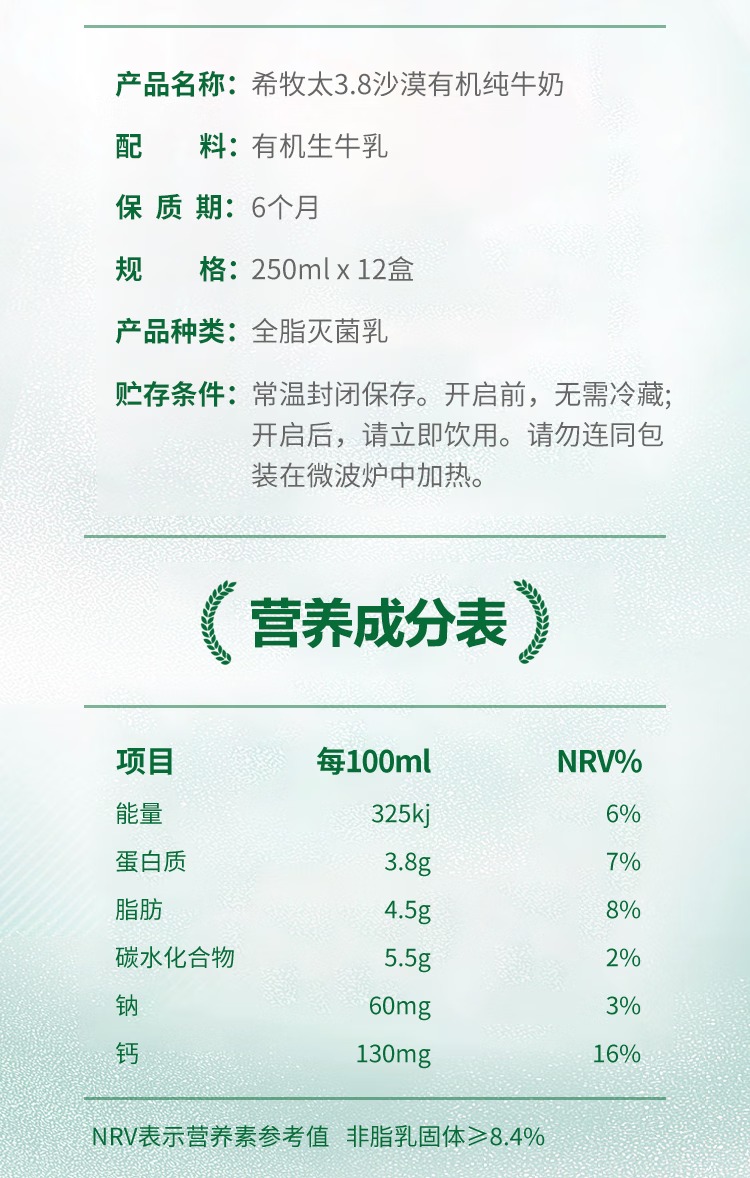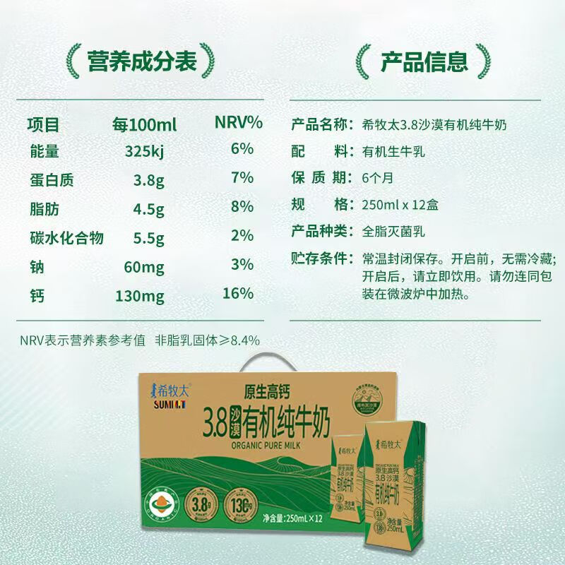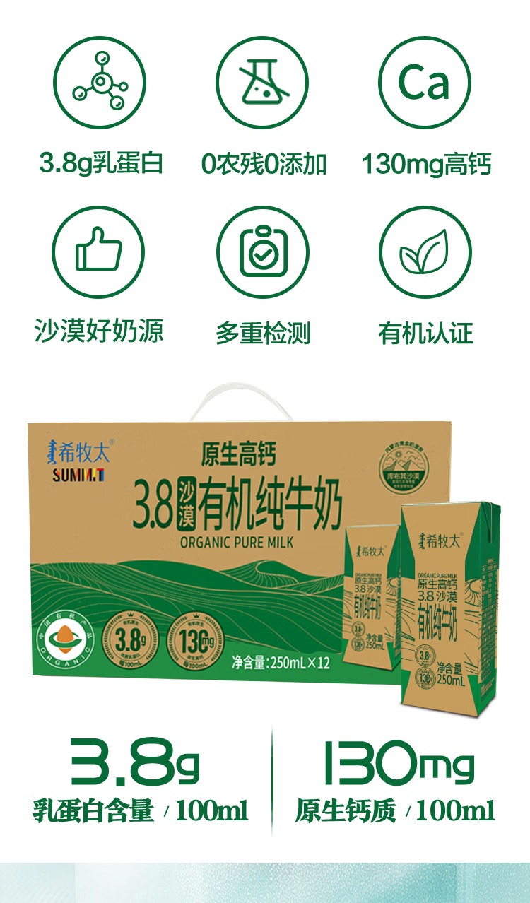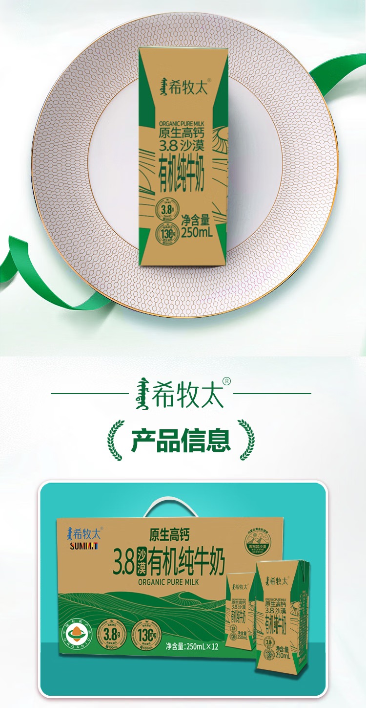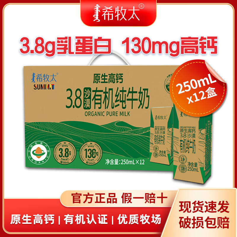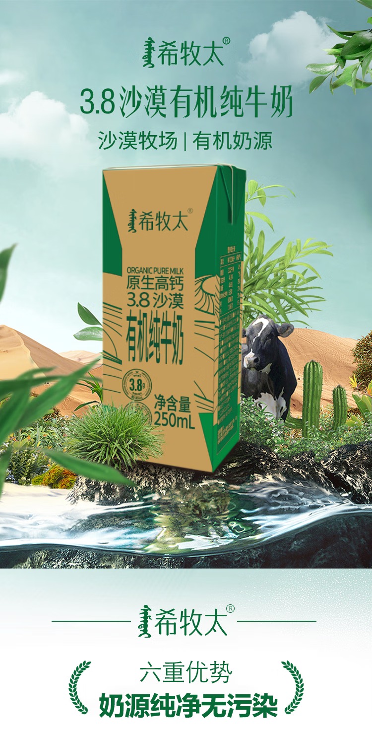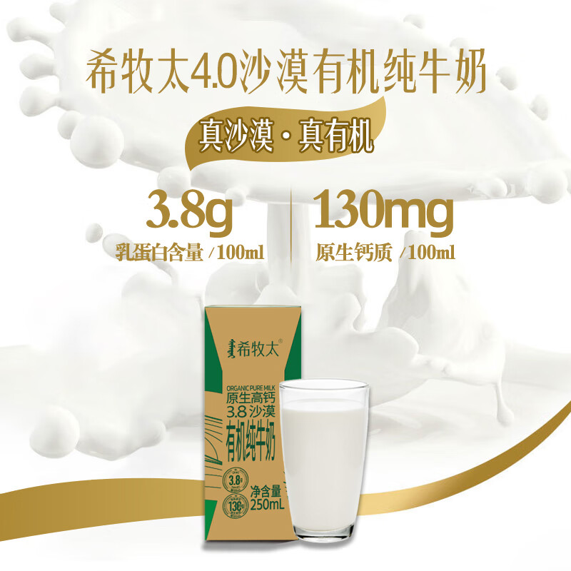 有机纯牛奶 3.8乳蛋白 130mg高钙 沙漠有机奶250ml*12盒 希牧太牛